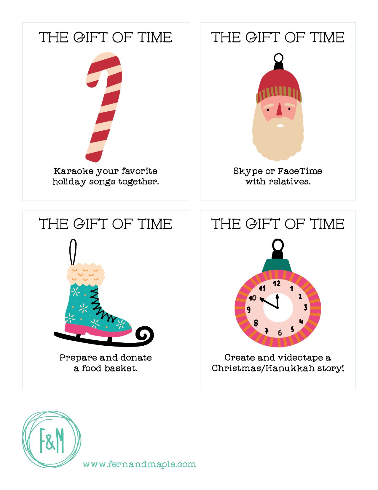 These cards were a collaboration between myself and event stylist Fern & Maple of Portland, Oregon. Enjoy spending time with your family by printing these Advent cards with prompts for activities. Choose one activity per day, counting down to Christmas, OR start early and begin today. There are 64, 4x4 cards in all. Happy holidays - we hope you enjoy! Email [email protected] and I'll send you a PDF file to print on your own.